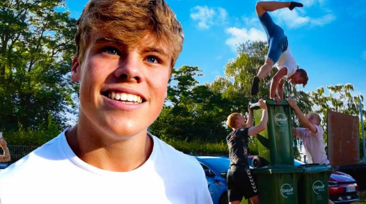 Flying Superkids bruger selvfølgelig også den grønne affaldsbeholder til at stå på hænder på. Det er der kommet både en YouTube-video (De travle kan spole frem til 04.11) og en TikTok ud af.