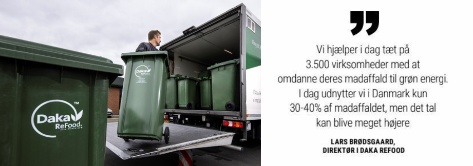”Vi hjælper i dag tæt på 3.500 virksomheder med at omdanne deres madaffald til grøn energi. I dag udnytter vi i Danmark kun 30-40% af madaffaldet, men det tal kan blive meget højere, og vi skal have mange flere til at genanvende affaldet klimavenligt i stedet for, at det ender på forbrændingen,” forklarer Lars Brødsgaard, direktør i Daka ReFood.